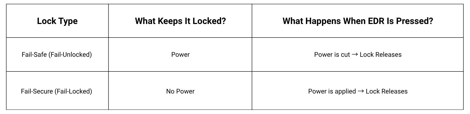 When activated, the EDR either interrupts or supplies power to the lock, depending on the type of locking mechanism, allowing the door to open without triggering fire alarm.